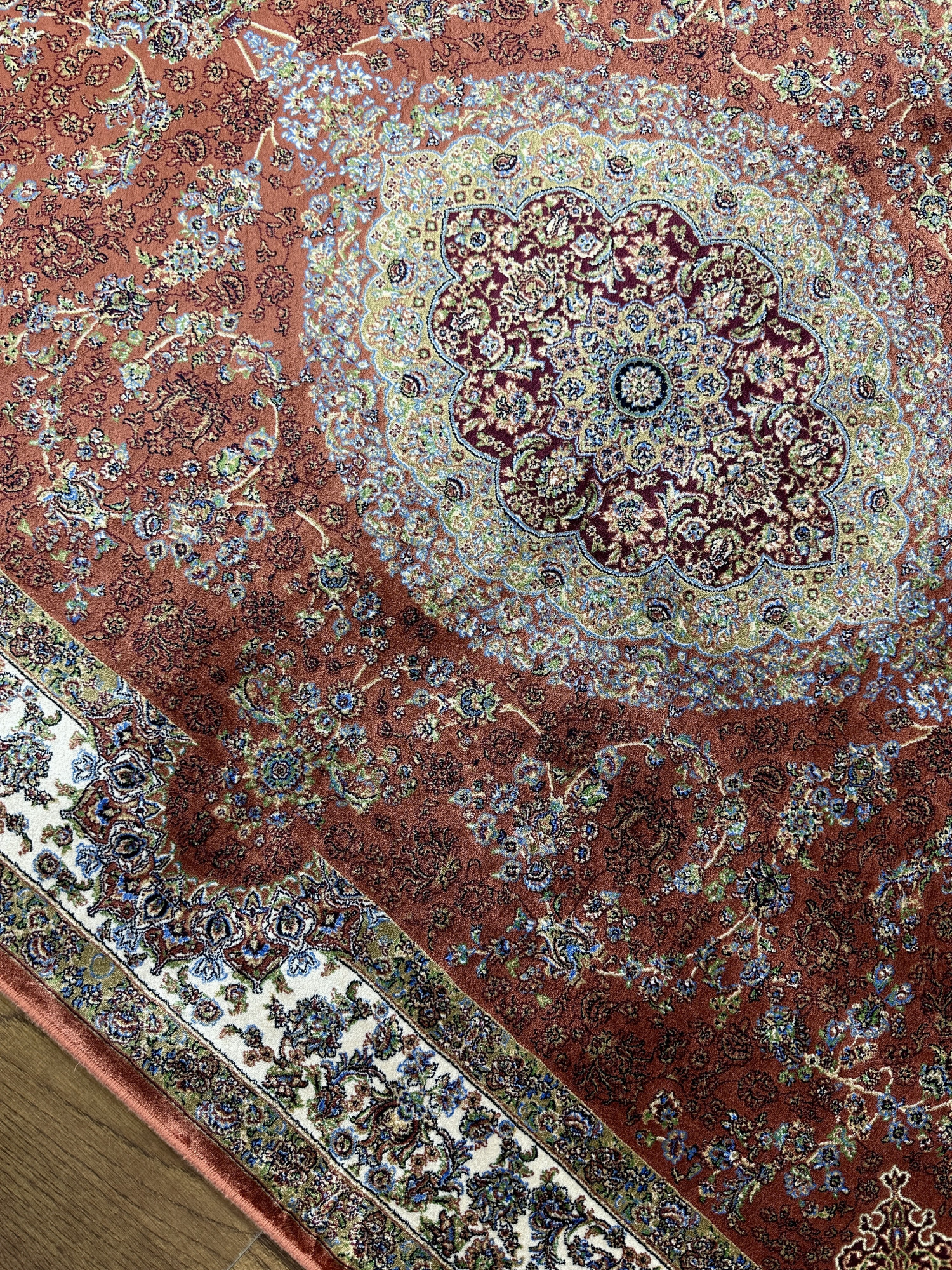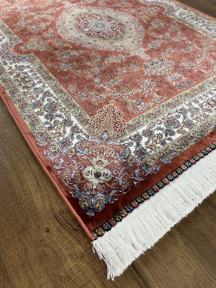 Материал. В этих коврах использовано сочетание двух материалов: модал (модернизированная вискоза с повышенными прочностными характеристиками) и натуральный шёлк. Использование в составе натурального шёлка позволяет этим коврам передавать визуальные и тактильные ощущения максимально приближенные к ощущениям, получаемым от шёлковых ковров ручной работы.