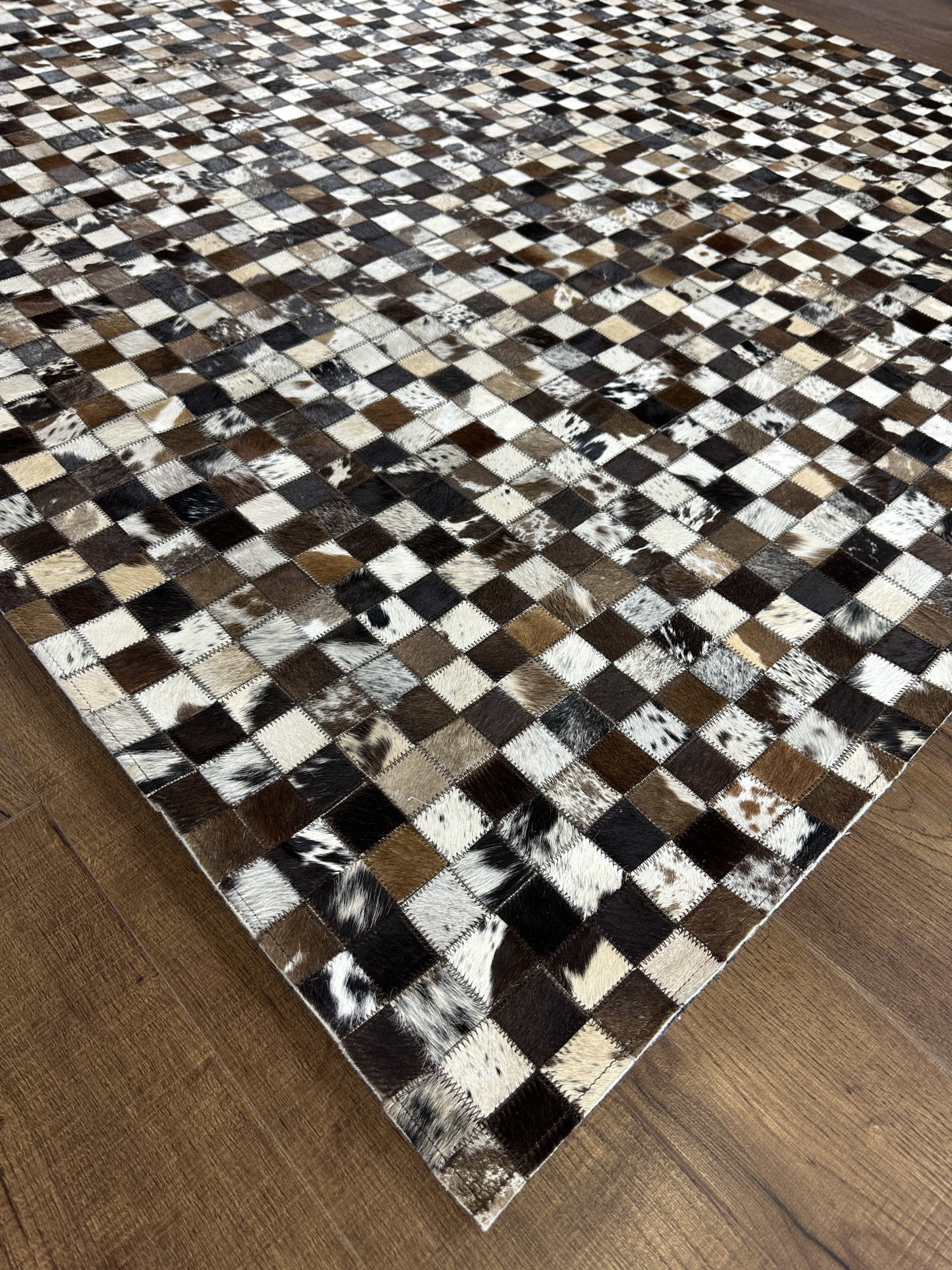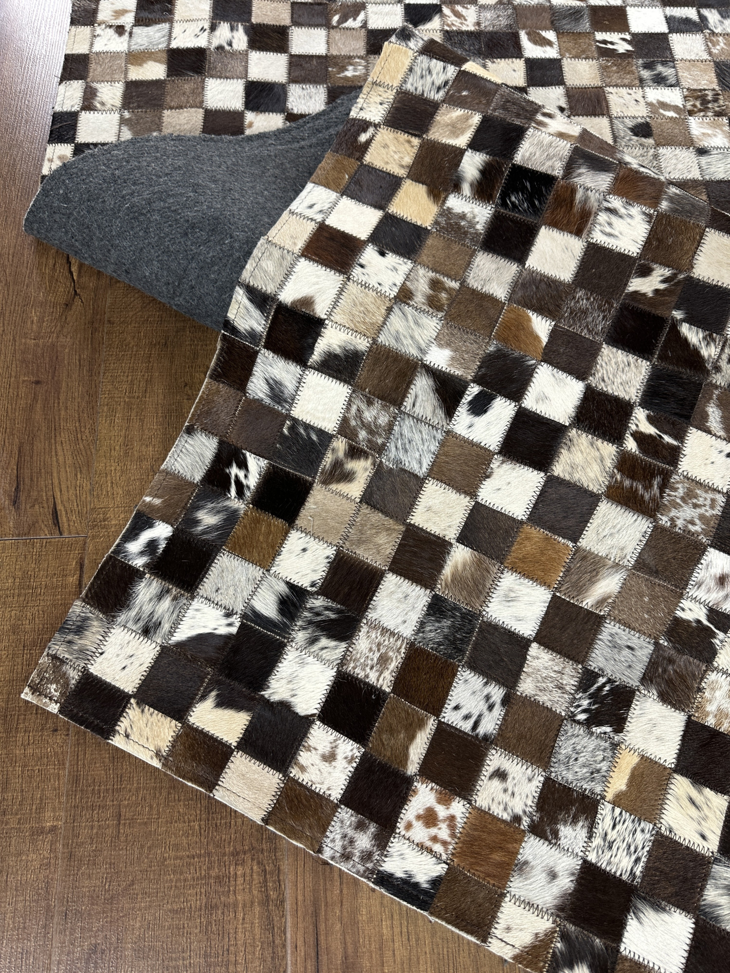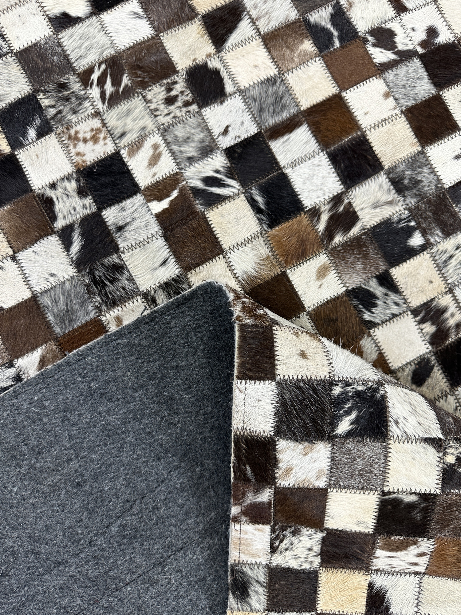 Оригинальные ковры ручной работы, выполненные из фрагментов шкур коровы. С тыльной стороны ковра к полотну из шкур прилегает войлочная подкладка. Несмотря на то, что ковёр тонкий (3мм), сочетание натуральной шерсти на шкуре и войлока на подкладке - ковёр будет передавать теплые тактильные ощущения даже в прохладных помещениях.