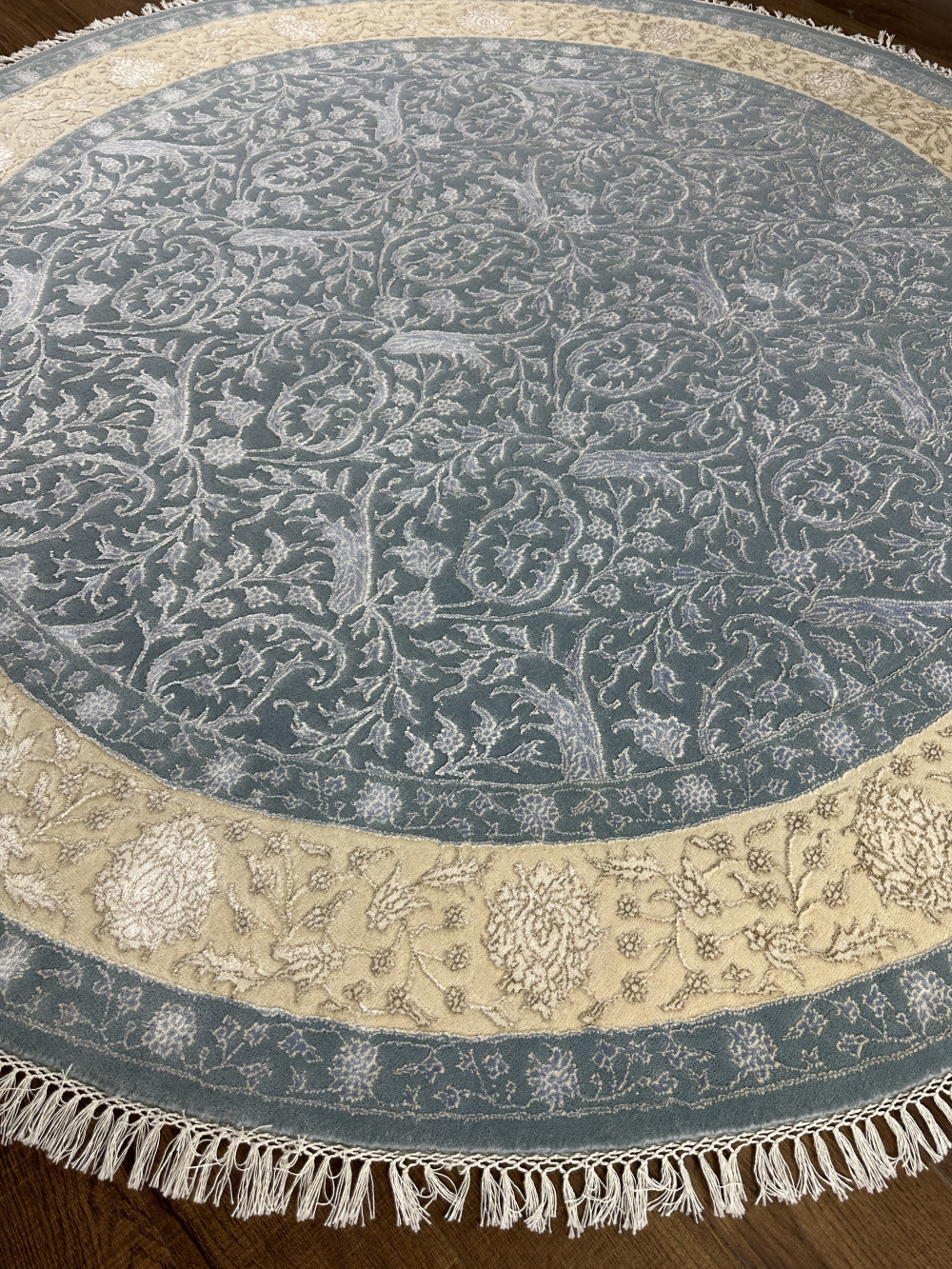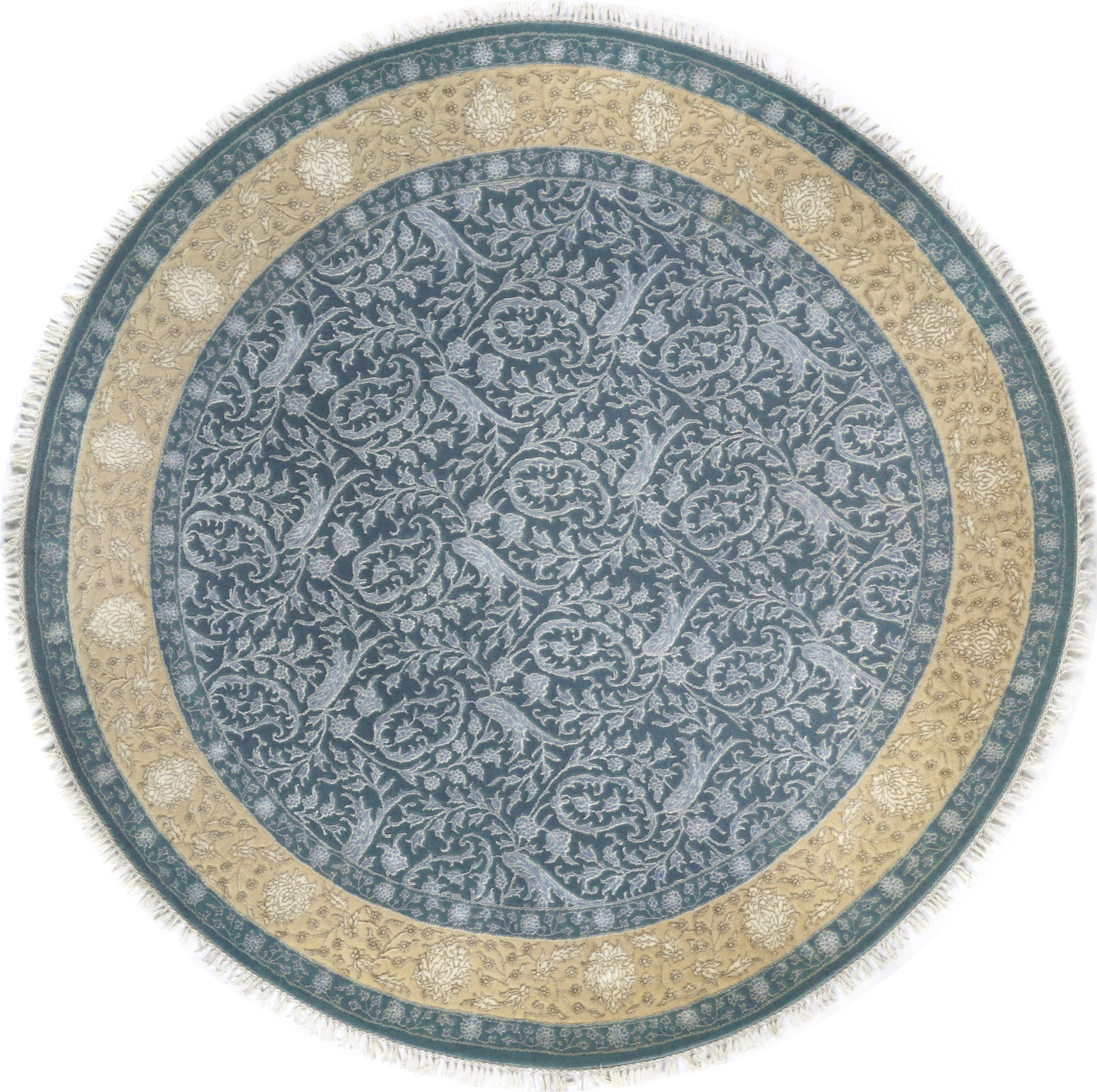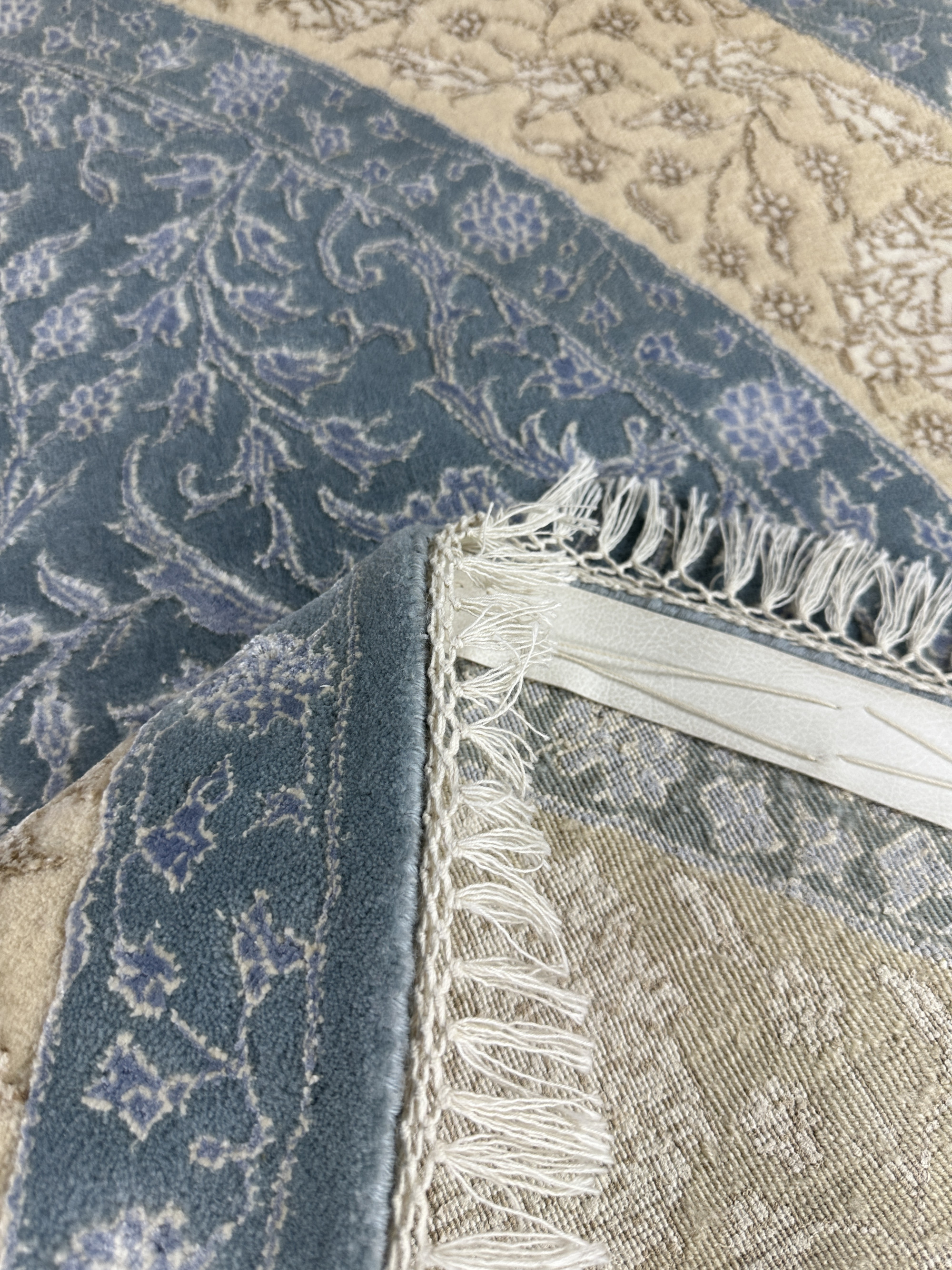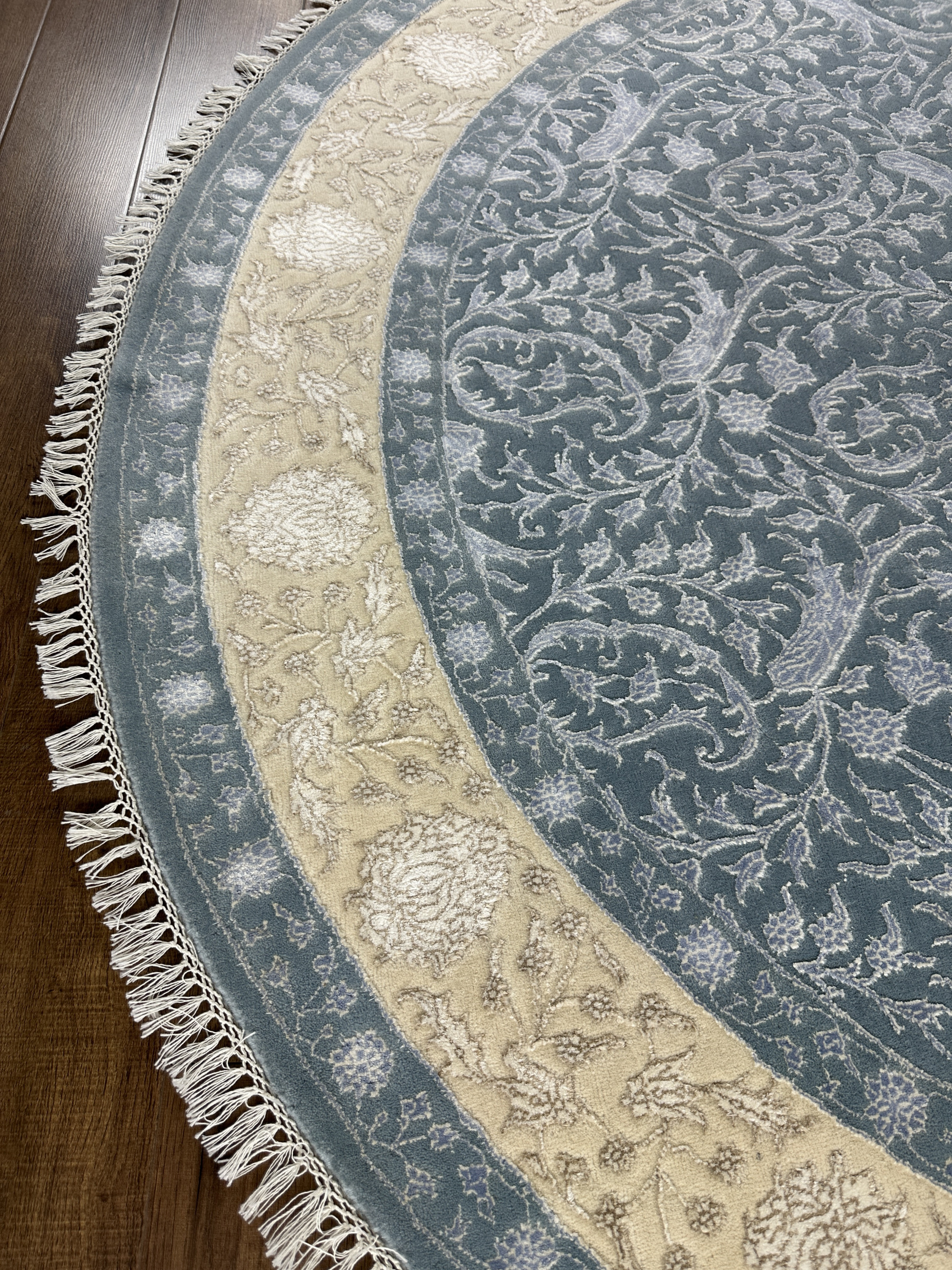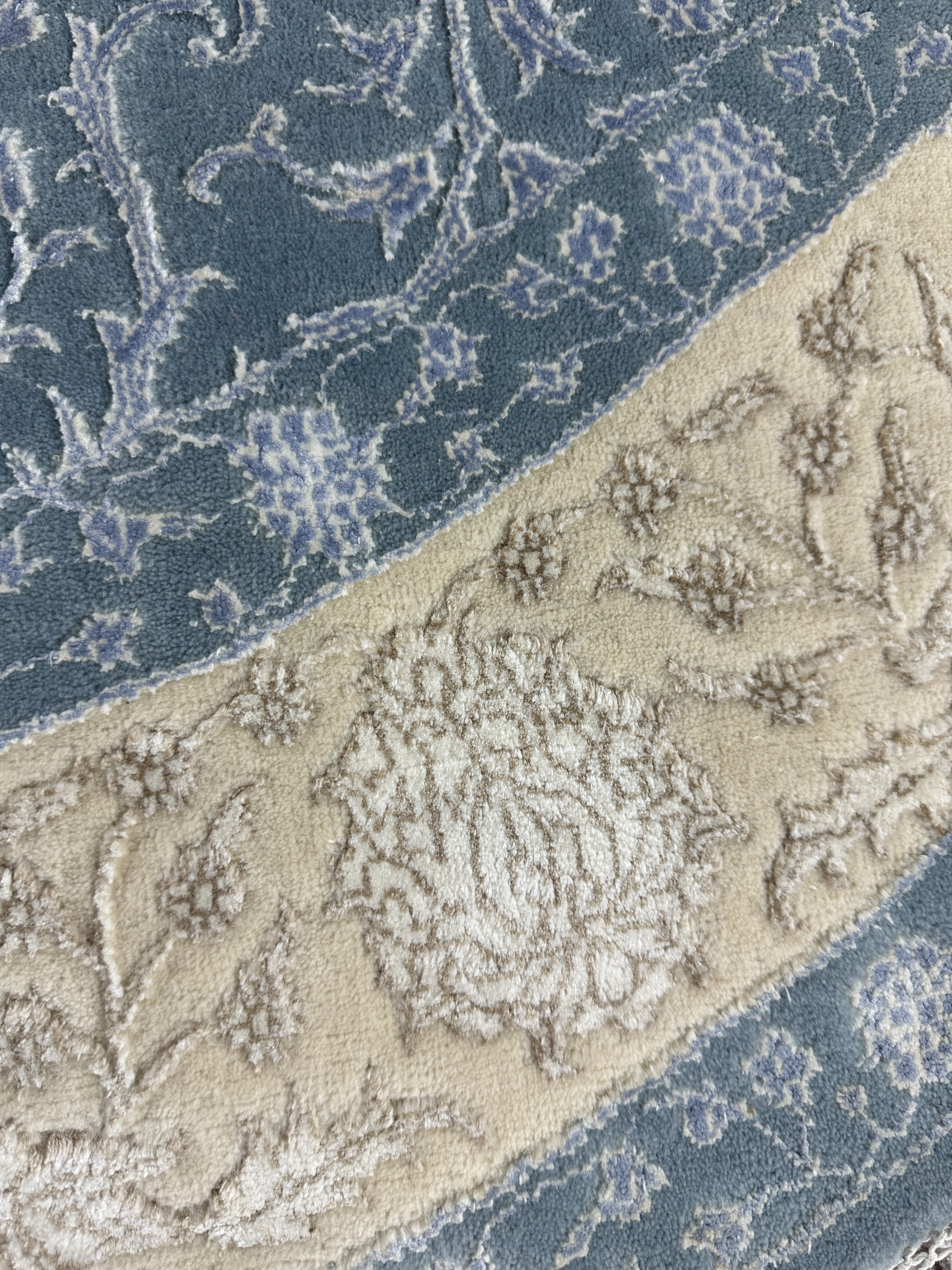 Ковры ручной работы из коллекции Indien Elysee созданы для неоклассических интерьеров из натуральных материалов – шерсти (матовый, фон) и шёлка (глянцевый, узор). Особенность этих ковров в ручной выстрижке элементов узора – узор возвышается над фоном ковра и создаёт ощущение объёмности рисунка. Комбинация шерсти и шёлка создаёт завораживающий эффект: в зависимости от яркости, температуры освещения и от угла обзора ковры выглядят по-разному. Достоинством этих ковров является не только то, что они изготовлены из натуральных материалов, но и высокая плотность узелков на 1м2 (325.000 узелков/м2). За счёт высокой плотности в ковре красиво исполнены даже мелкие детали узора.