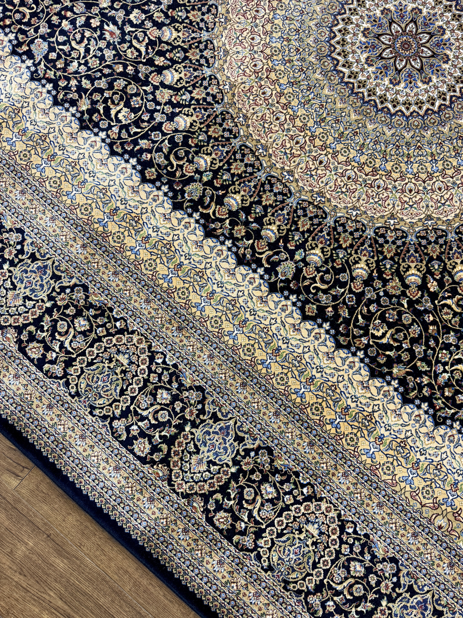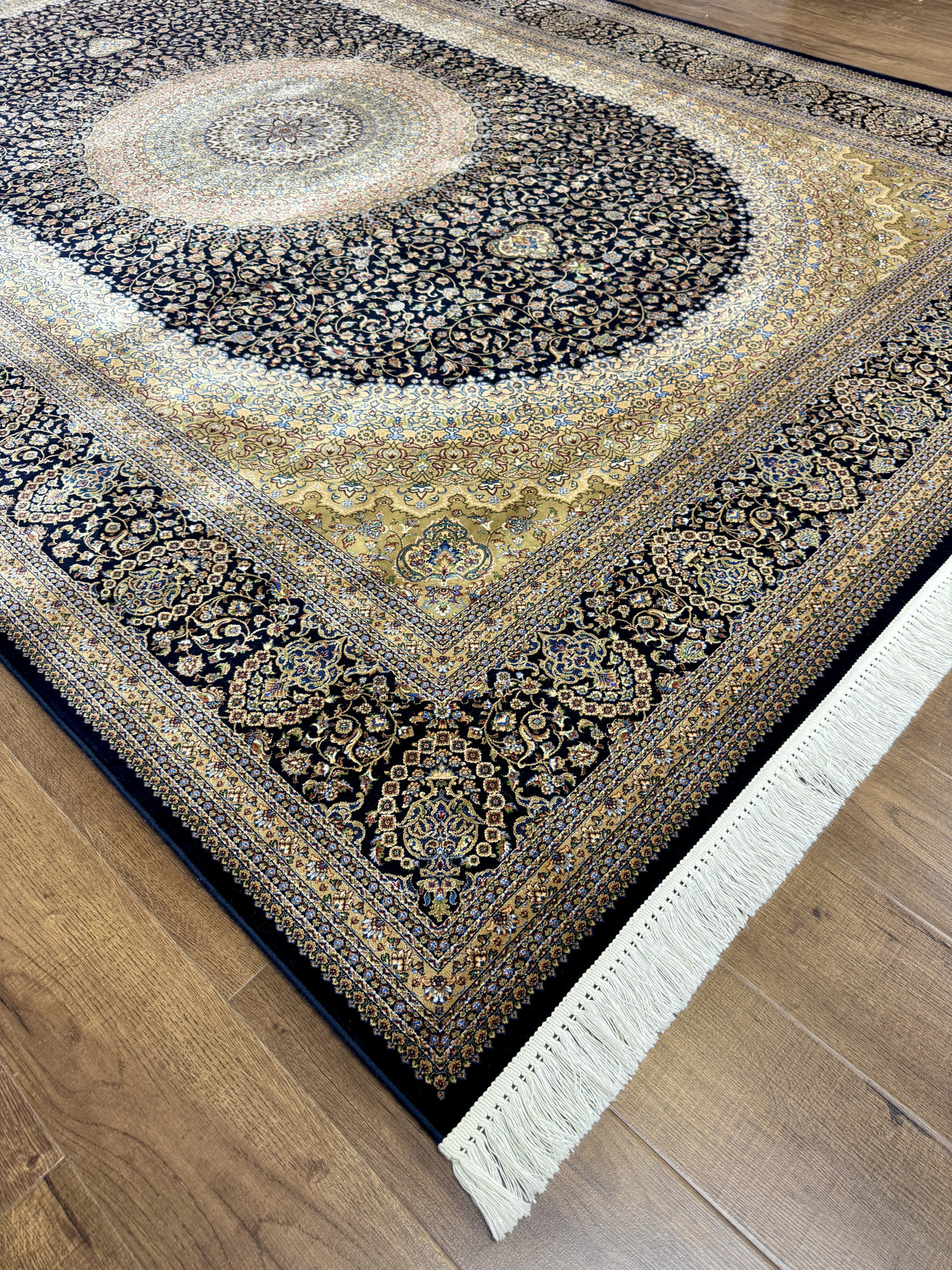 Материал. В этих коврах использовано сочетание двух материалов: модал (модернизированная вискоза с повышенными прочностными характеристиками) и натуральный шёлк. Использование в составе натурального шёлка позволяет этим коврам передавать визуальные и тактильные ощущения максимально приближенные к ощущениям, получаемым от шёлковых ковров ручной работы.