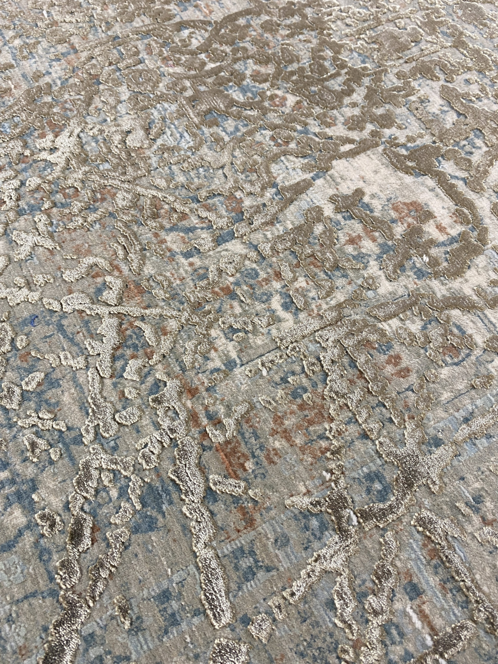 Ковры изготовлены из комбинации двух материалов: бамбуковый шёлк (модернизированная вискоза) – верхний уровень ворса, глянцевая поверхность; акрил – экологичный материал, используемый в производстве ковров в качестве альтернативы шерсти, обладает схожими тактильными ощущениями и физическими свойствами, имеет матовую поверхность. За счет комбинации этих двух материалов создаются удивительные визуальные ощущения: ковёр выглядит по-разному в зависимости от температуры, уровня освещенности и угла обзора.