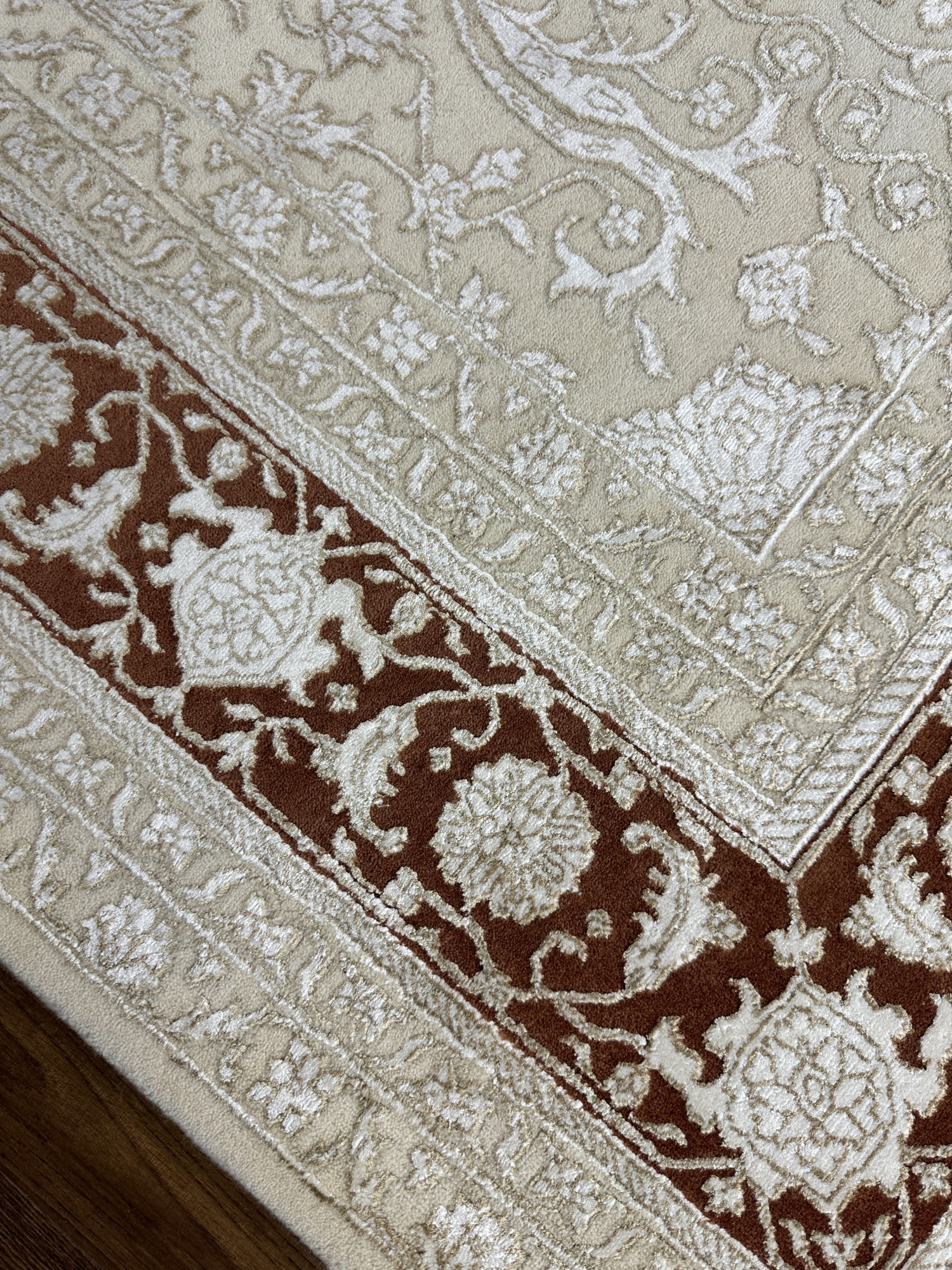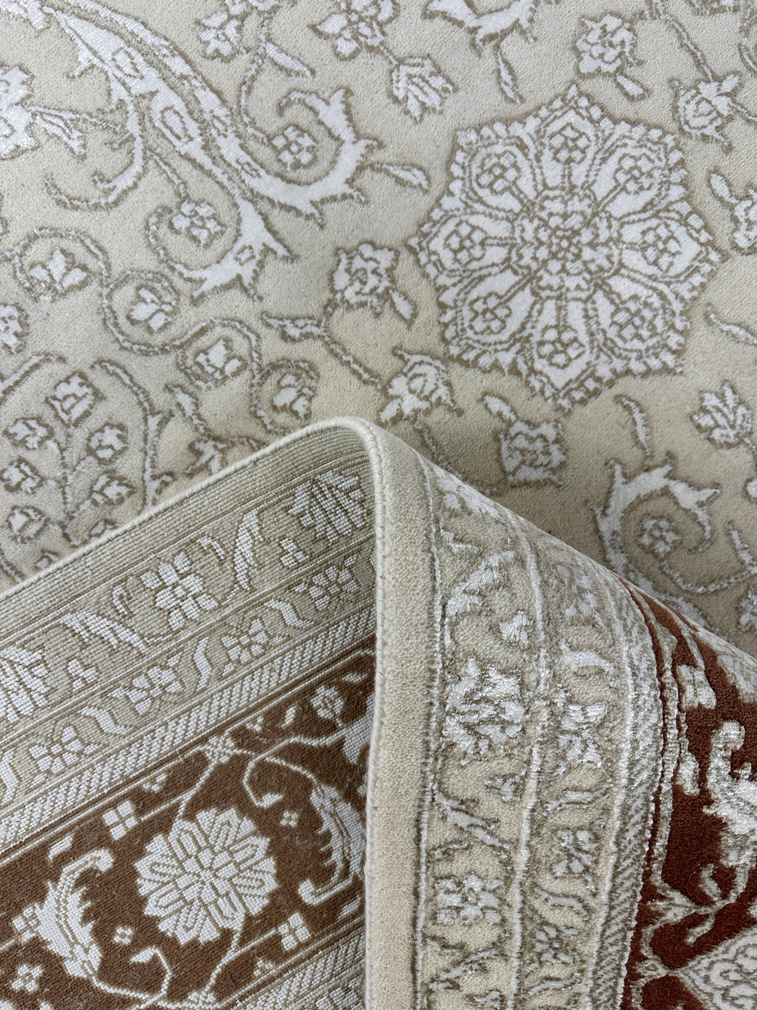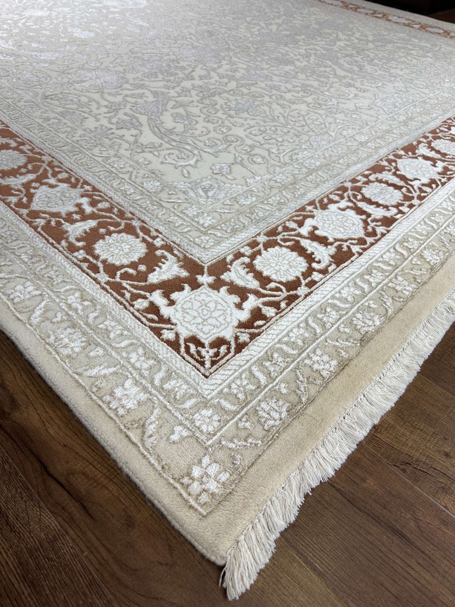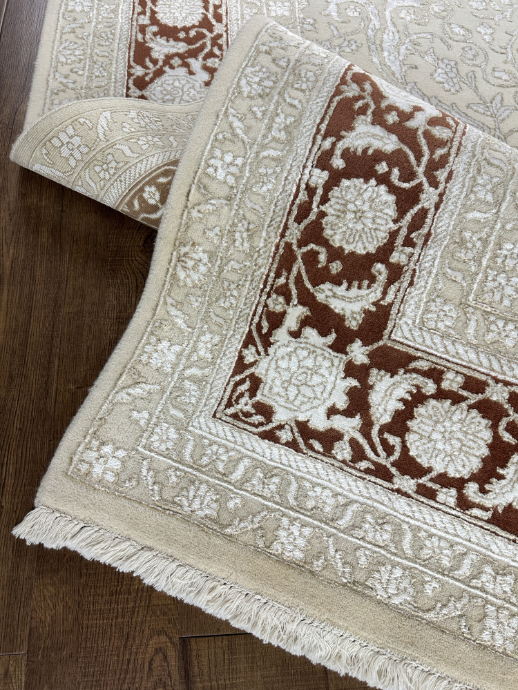 Ковры ручной работы из коллекции Indien Elysee созданы для неоклассических интерьеров из натуральных материалов – шерсти (матовый, фон) и шёлка (глянцевый, узор). Особенность этих ковров в ручной выстрижке элементов узора – узор возвышается над фоном ковра и создаёт ощущение объёмности рисунка. Комбинация шерсти и шёлка создаёт завораживающий эффект: в зависимости от яркости, температуры освещения и от угла обзора ковры выглядят по-разному. Достоинством этих ковров является не только то, что они изготовлены из натуральных материалов, но и высокая плотность узелков на 1м2 (325.000 узелков/м2). За счёт высокой плотности в ковре красиво исполнены даже мелкие детали узора.