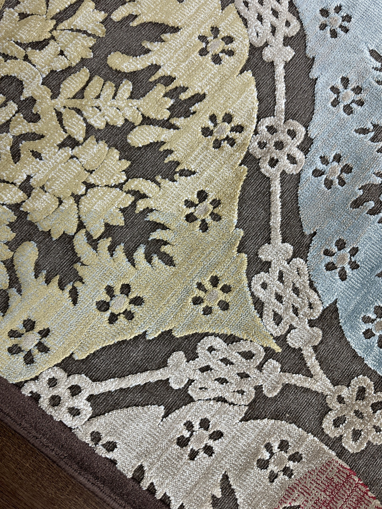 Ковёр из коллекции Relief Silk выполнен из высококачественного вискозного волокна, также можно встретить названия материалов: арт шёлк, модал, бамбуковый шёлк, и другие виды искусственного шёлка. Вискоза известна тем, что этот материал повторяет свойства натурального шёлка, меняет цвет, переливается, играет красками в зависимости от освещения и угла обзора, а также вискоза передаёт мягкие, нежные тактильные ощущения.